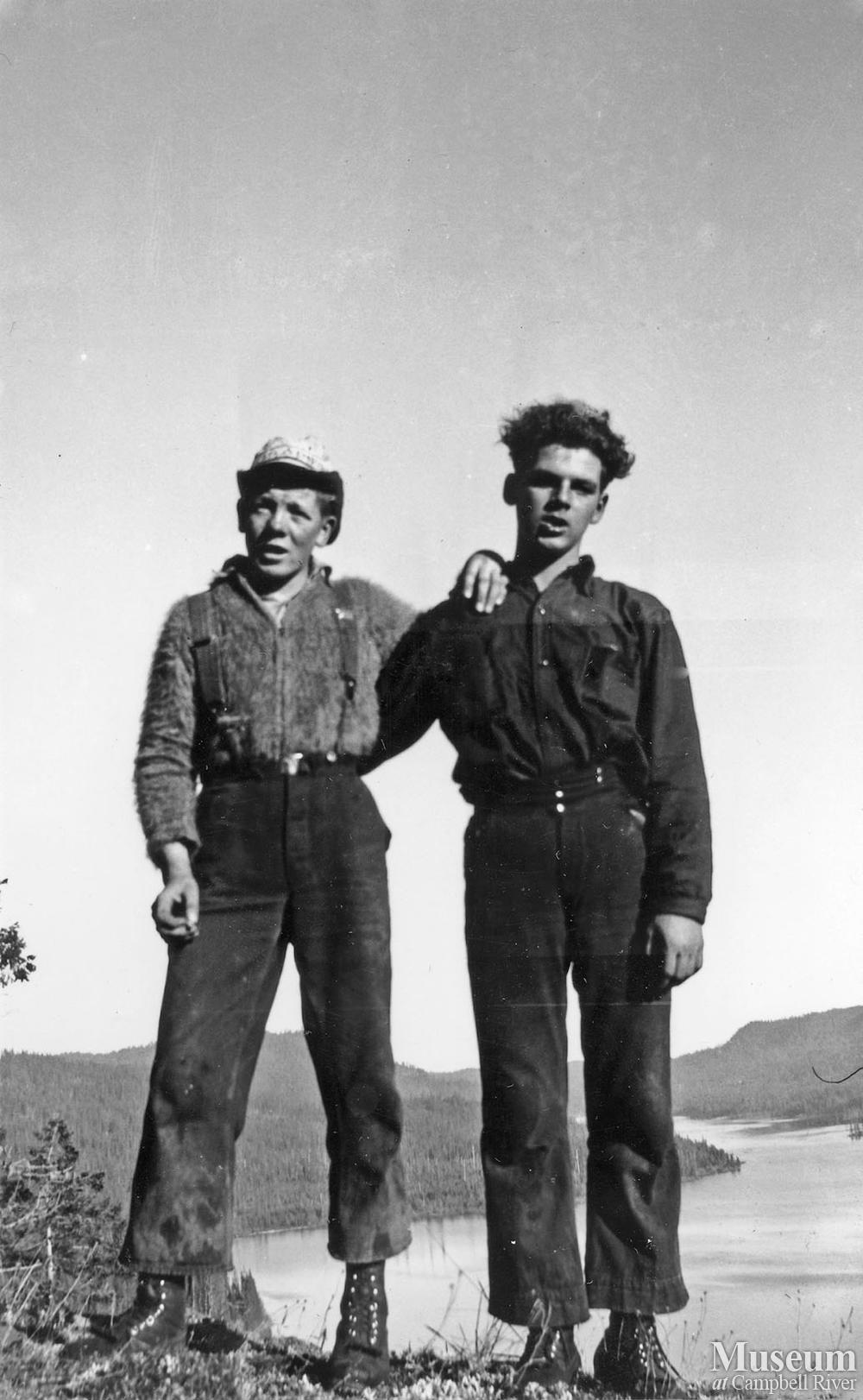 Bob English and one unidentified man standing a hilltop likely near ERT's operations along the Campbell Lake area.