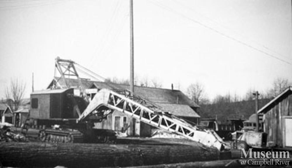 Log loader is being worked at ERT Camp 8 near Echo Lake the camp warehouse is the building in the background.