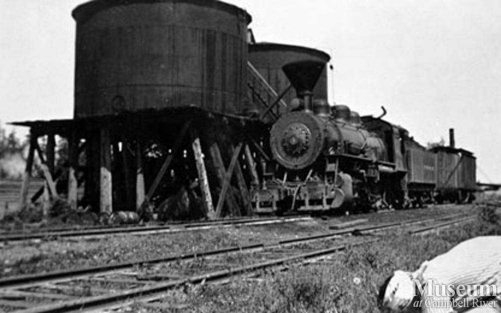 The ERT locomotive fuel tanks were located near their dumping grounds at the mouth of the Campbell River. The 5-spot locomotive on rail line beside the tanks.