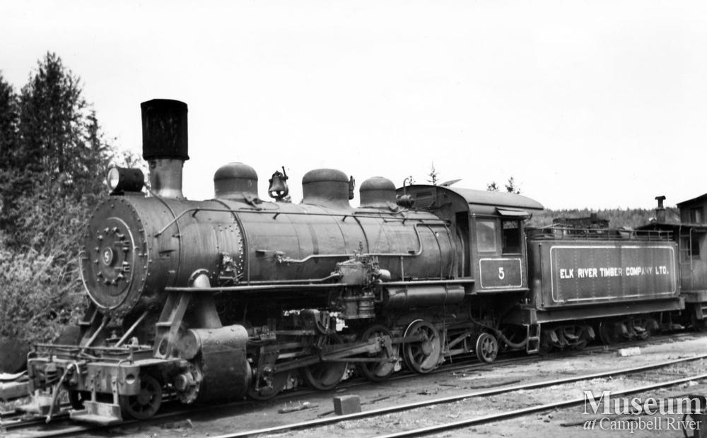Elk River Timber Co.'s 5 spot locomotive, a Porter 2-8-2. The 5 spot was used on their mainline and was bought in 1928 for the International Timber Co. Andy Teck of Campbell River was a long-time engineer on her. The bell and name plate are currently part of the Museum at Campbell River's collection.