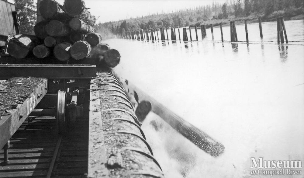 Unloading logs at the ERT log dump in the Campbell River Estuary.