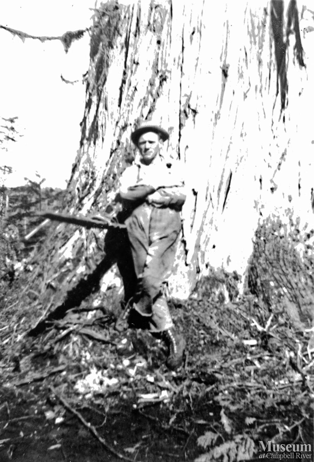 Willie Granlund beside a large cedar between the mine and the old Upper Quinsam Lake.