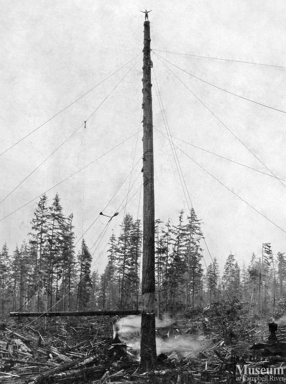 High rigger Ed Coola poses on top of a newly rigged tree at a Bloedel logging operation.
