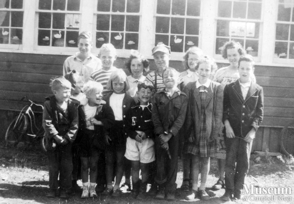 A group of school children in front of the new school at Granite Bay . At this time many of the children from the nearby Coal Creek Logging Ltd. camp attended this school.
