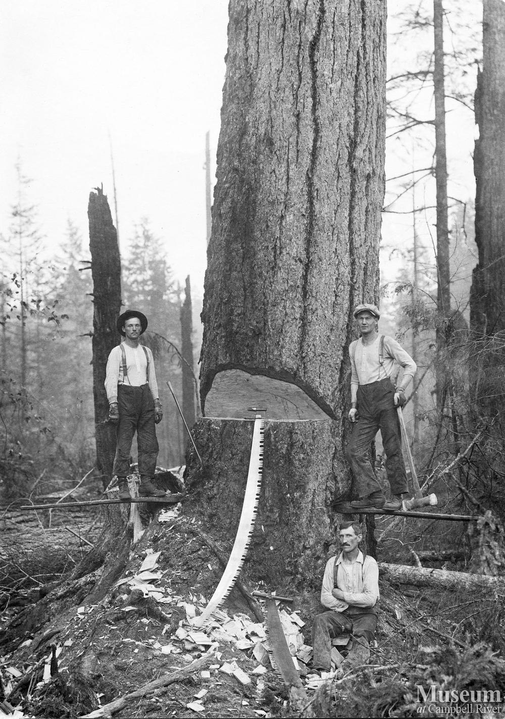 Hand fallers on springboards working on an under cut