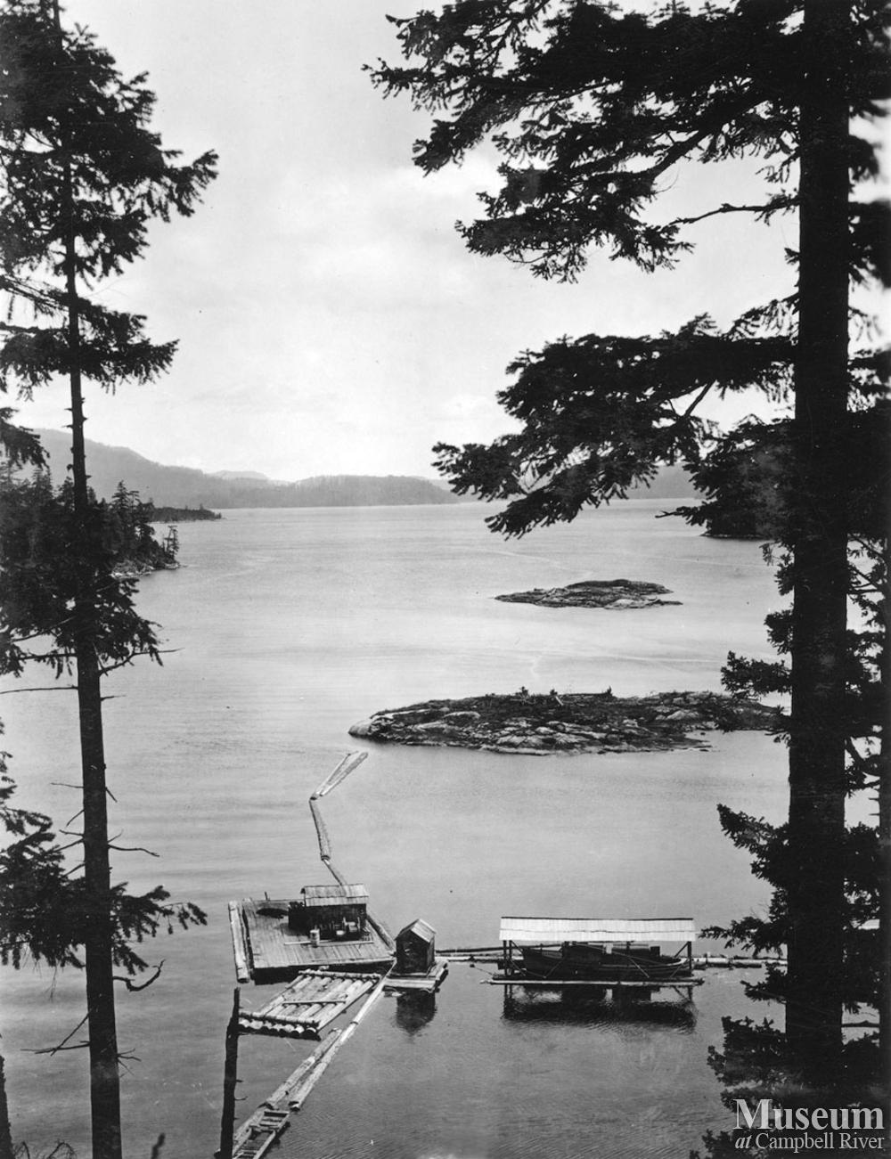 View of the wharf, boats, and boathouse at Hasting Co. camp C at Hemming Bay, Thurlow Island.