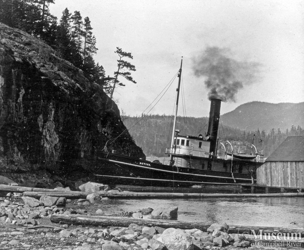 View of tugboat 'Active' tied up at wharf at Rock Bay.