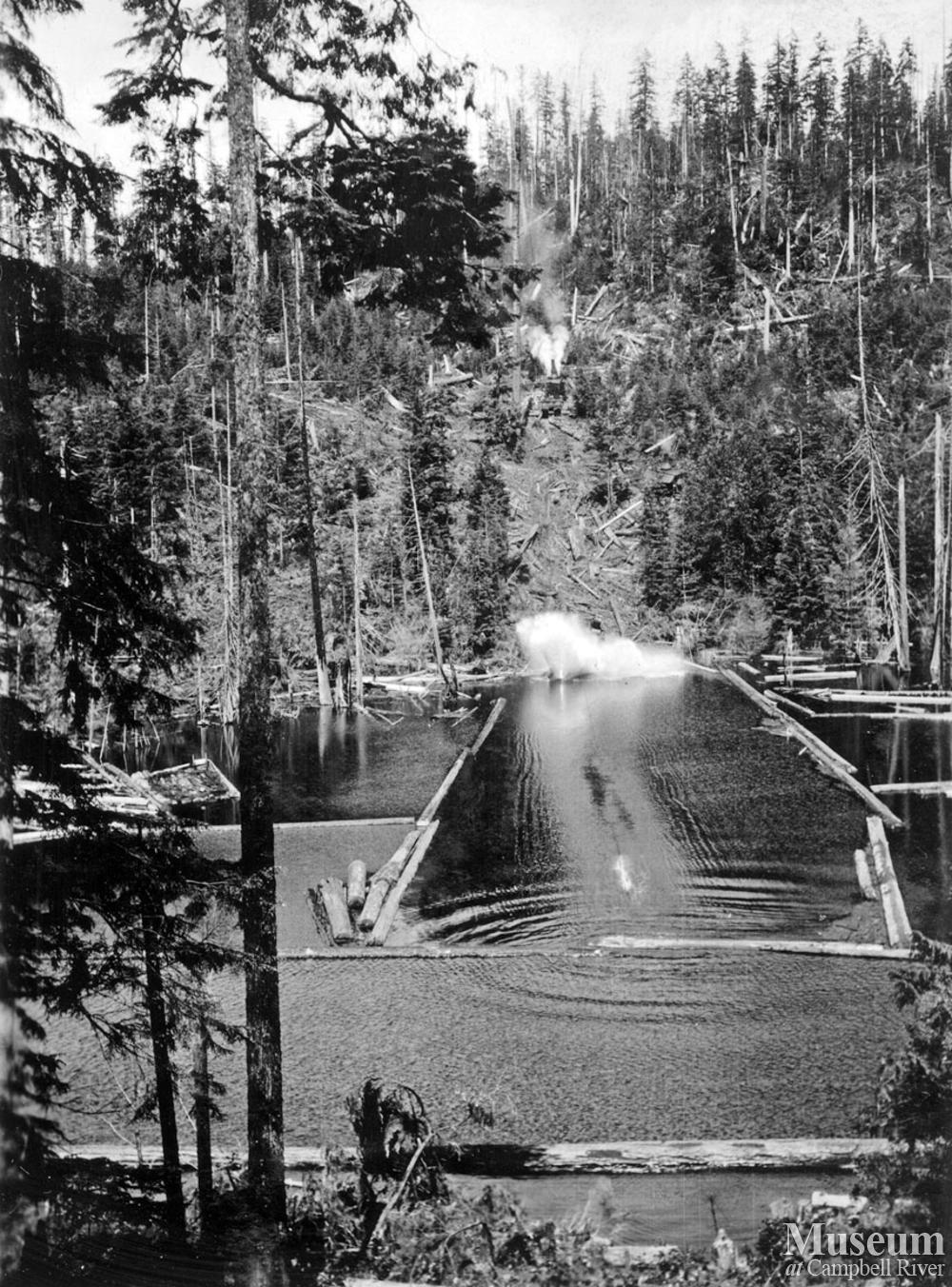 Tightlining logs into the water at the Hasting Co. Camp C operations at Hemming Bay.