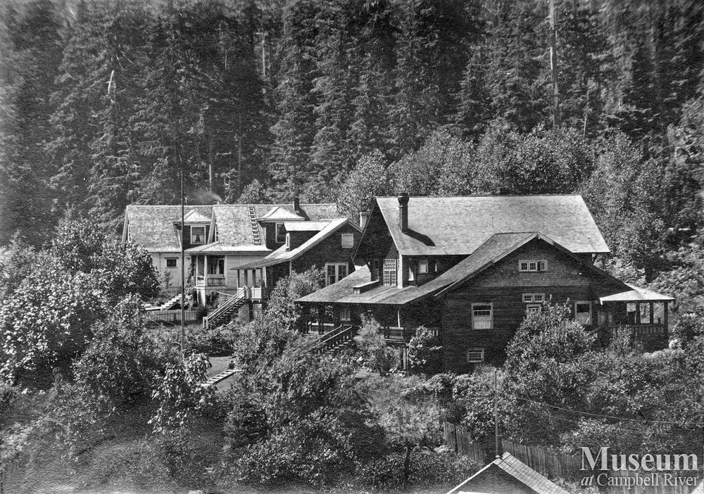 View of family homes and hospital at the Hasting Co. operations at Rock Bay. From left : Struthers home, Des Brisays- camp time keeper home, McCallums home and Rock Bay Hospital.