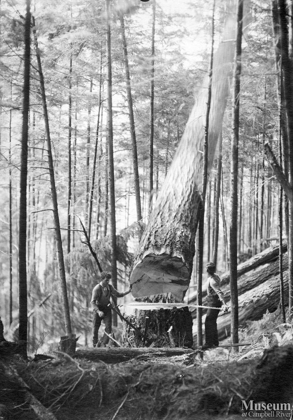 Fallers Joe Casey (left) and Art Bellarby (right) falling a tree with a cross cut saw.