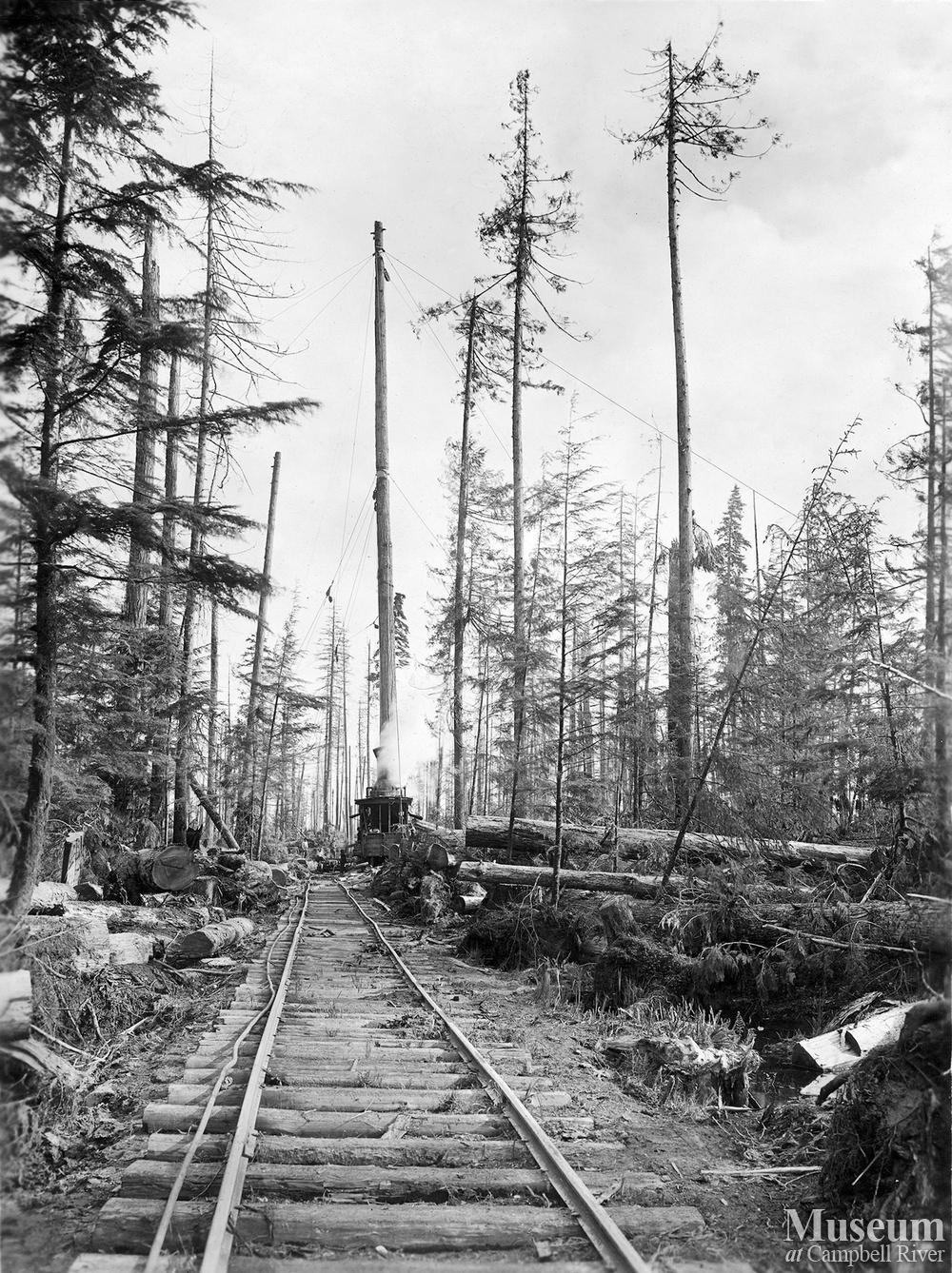 High lead spar tree and view from distance of Willamette Yarder and loader, near Bloedel, Stewart and Welch camp, in their British Columbia operations 70 miles north of Vancouver. Spar tree 180 feet high.
