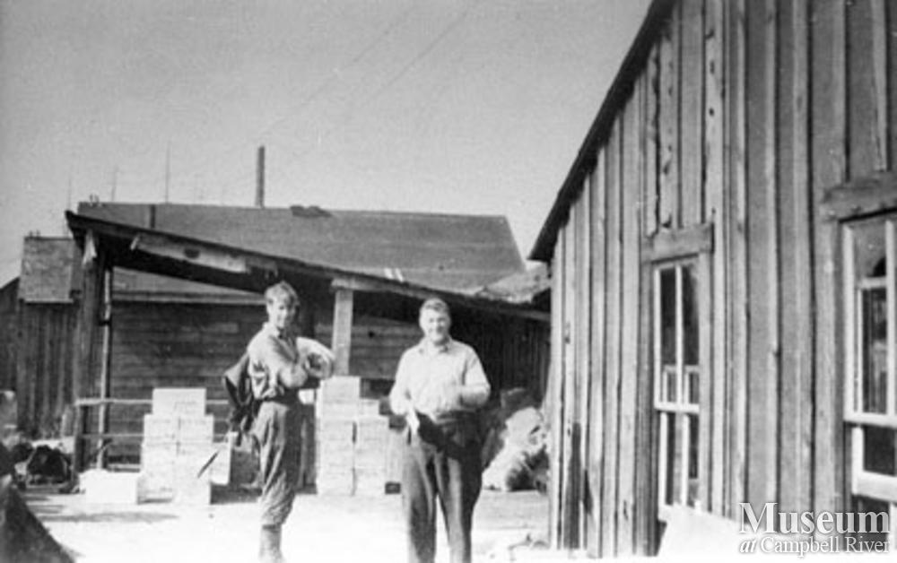 Gordon Jamieson and Frank McCarthy, with the cookhouse on right.