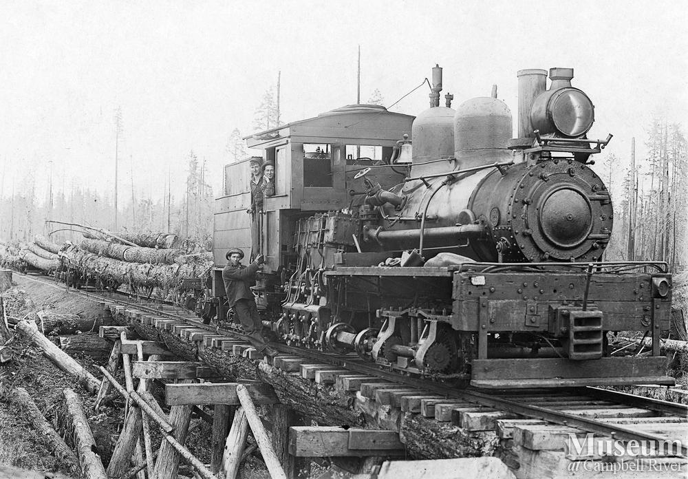 International Timber Co. locomotive near Campbell River. Guy Elgood looking out of cab door with a cap on (after working at I.T he served in World War 1 and died in England of the flu in 1918).