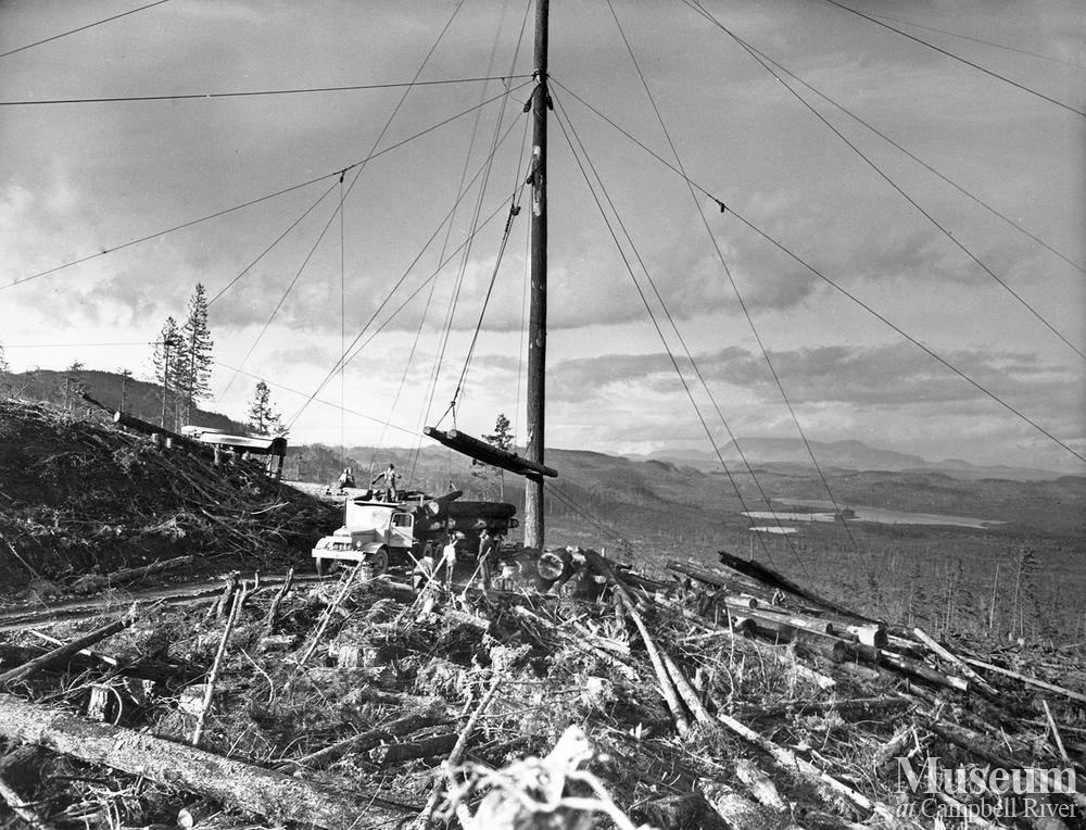 Logs being loaded into a truck by spar tree - head loader Grantly Hinch working under the boom.