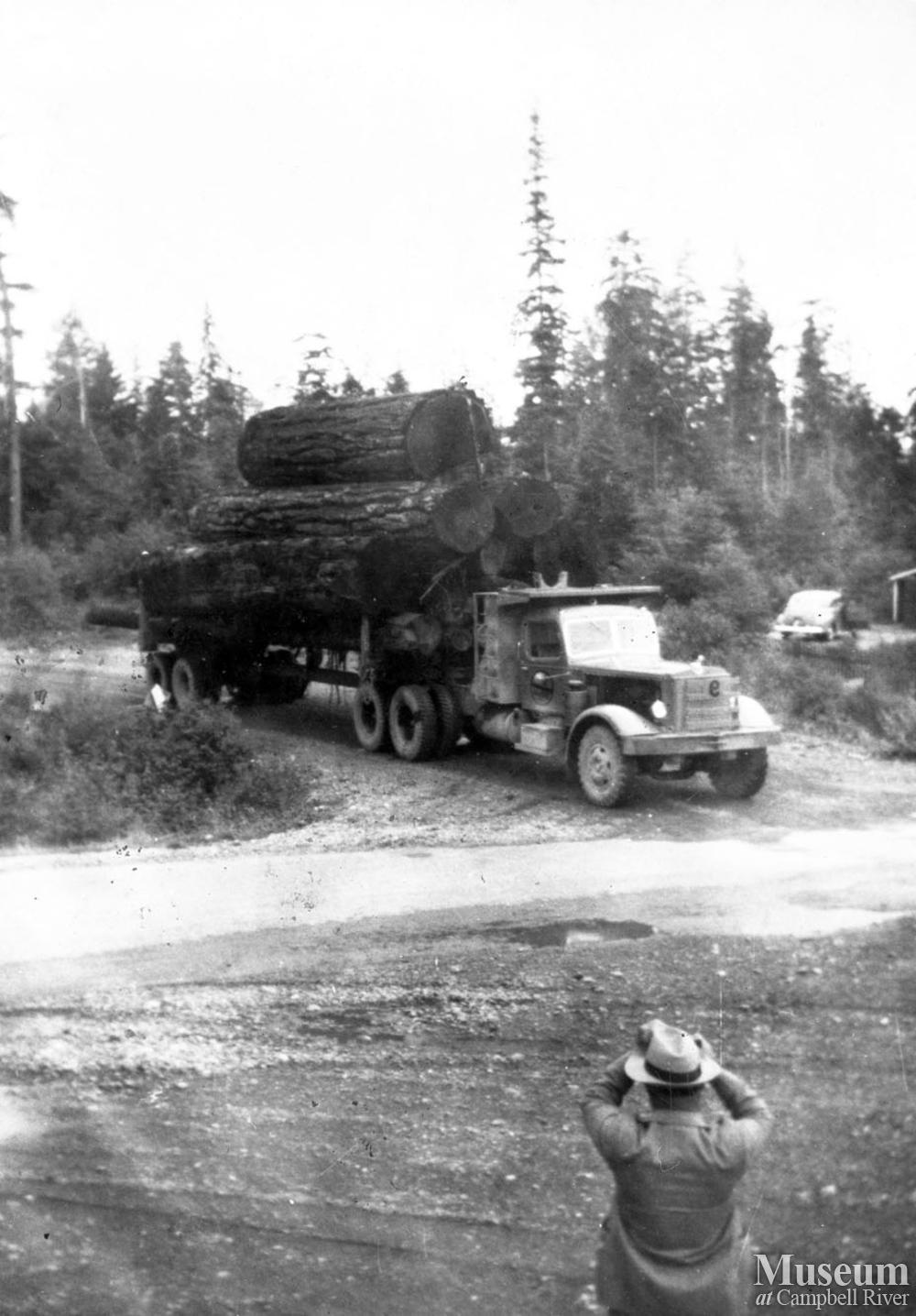 Pete Palmer taking a photo of a loaded logging truck crossing the Island Highway.
