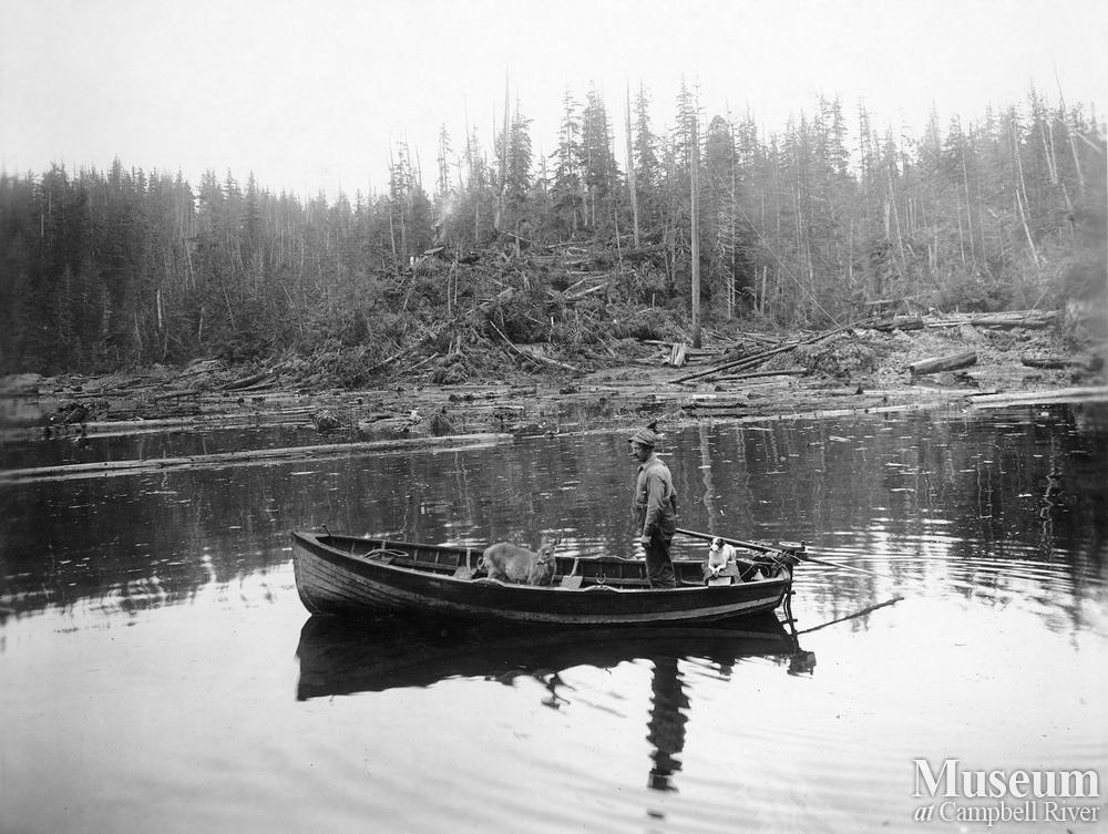 Leonard Frolander, fox terrier and 'Jim' the pet deer in a motor boat, at Clark and Lyford, Ltd. Camp 2 Booker Lagoon, B.C.