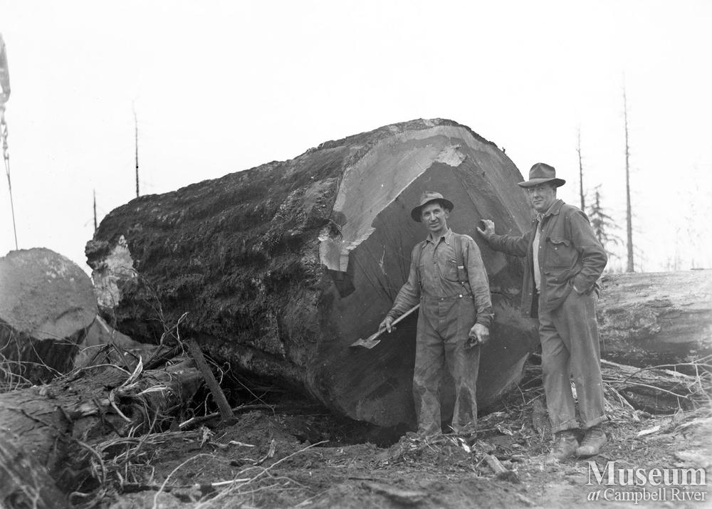 Joe Zanatta (on left) was the owner of Quinsam Trucking and a sawmill on the Campbell River, he also logged a few tracts of land in the Campbell River area (one along the Quinsam River and another up near Gooseneck Lake).