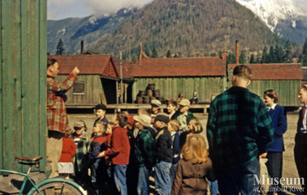 Kids at Woss post office, cookhouse in back
