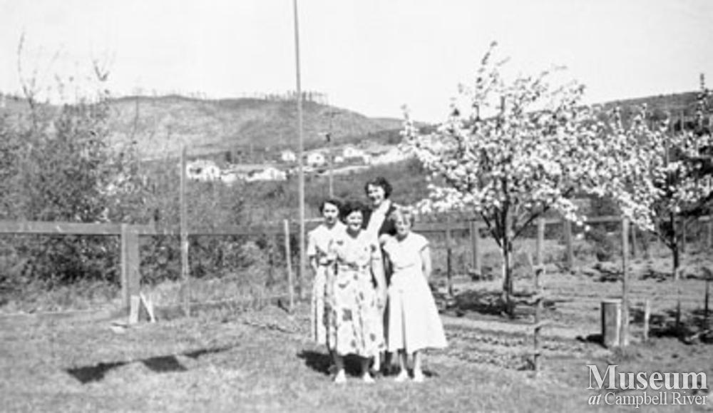 Jenny Fossum, Pat Baynon, Margaret Laird, and Gertie Kusha in the Kusha's backyard at Bloedel, Stewart and Welch Camp 5.
