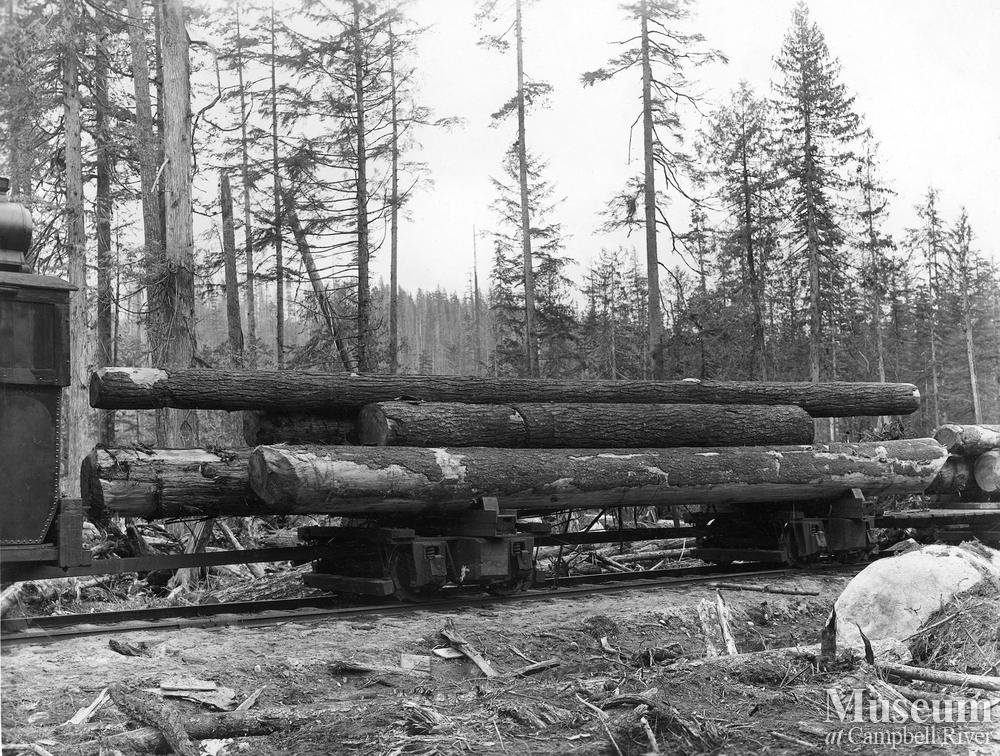 View of car having Fir, Cedar, Hemlock and White Pine logs in its load, lengths up to 72 feet, taken at landing of "Camp H", British Columbia Mills Timber and Trading Company, Rock Bay, B.C., Vancouver Island.