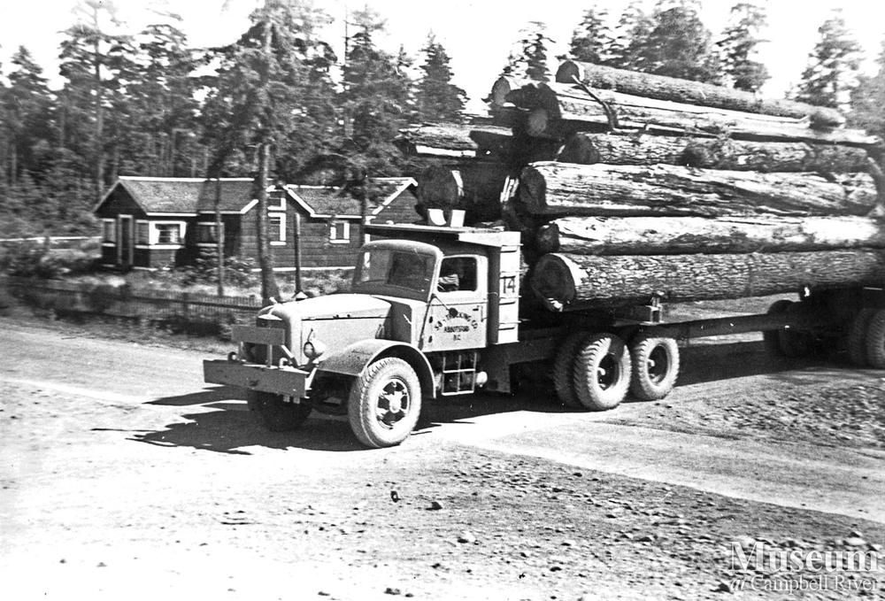 Loaded truck belonging to S and S truck (Schnare and Schnare Trucking). They were contractors for Iron River Logging. The house on the left belonged to the Boggs family.