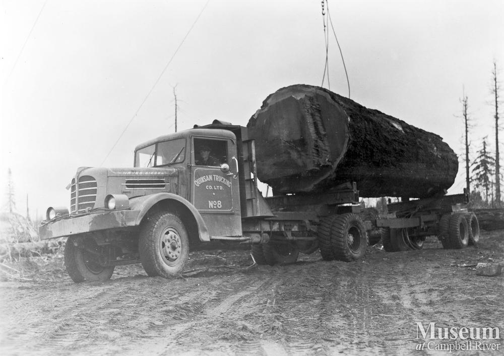 Lawrence Baker is driving the truck. Quinsam Trucking was owned and operated by Joe Zanatta, who also operated a sawmill in the Campbell River area.