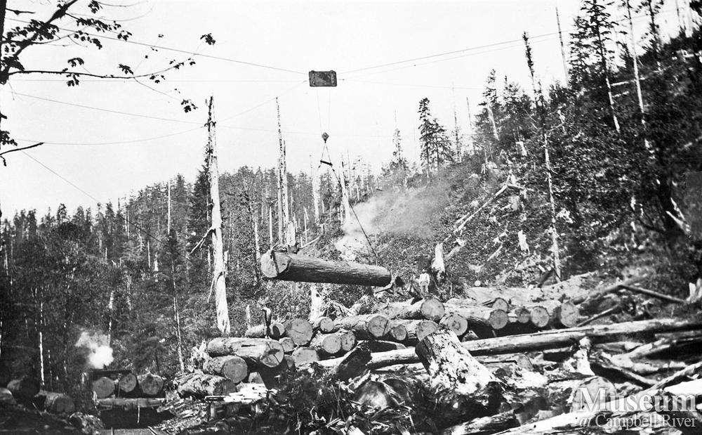 Loading logs with the use of 'L' hooks on a skyline onto rail cars. This was an extremely unstable and dangerous process.