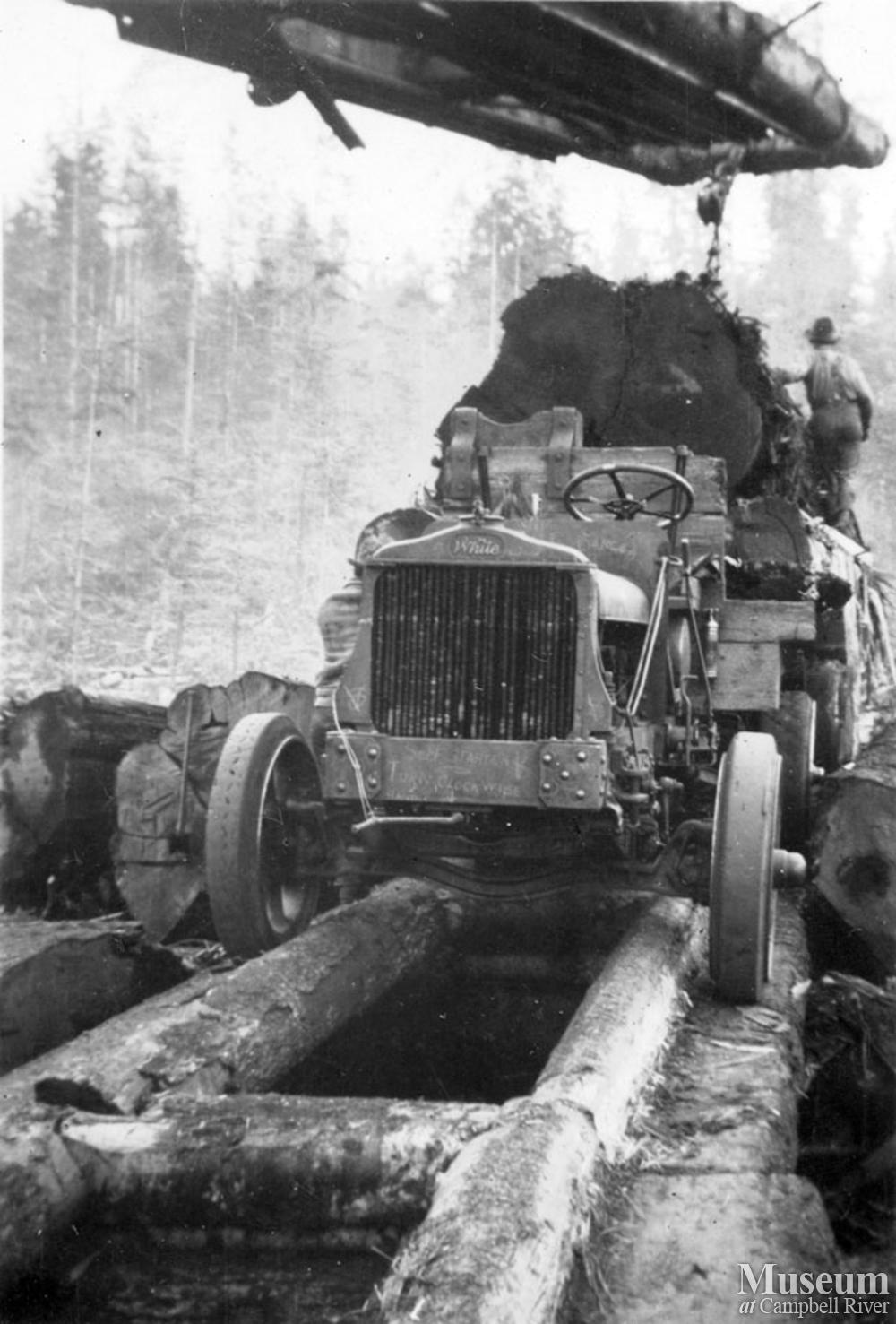Early White logging truck on a fore-an-aft road being loaded with a hayrack boom. Likely taken in the Port Neville area and part of the Byles and Groves Logging Co.