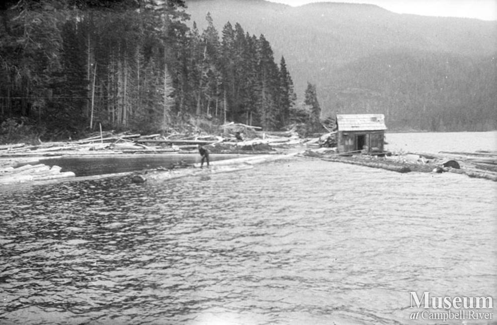 Buster on the log boom (likely Buster Lansdowne). This photograph was likely taken when Roderick Haig-Brown, along with Ed and Buster Lansdowne spent the summer beachcombing logs from the Nimpkish Lake. The logs that they collected had escaped when being floated to the railhead.
