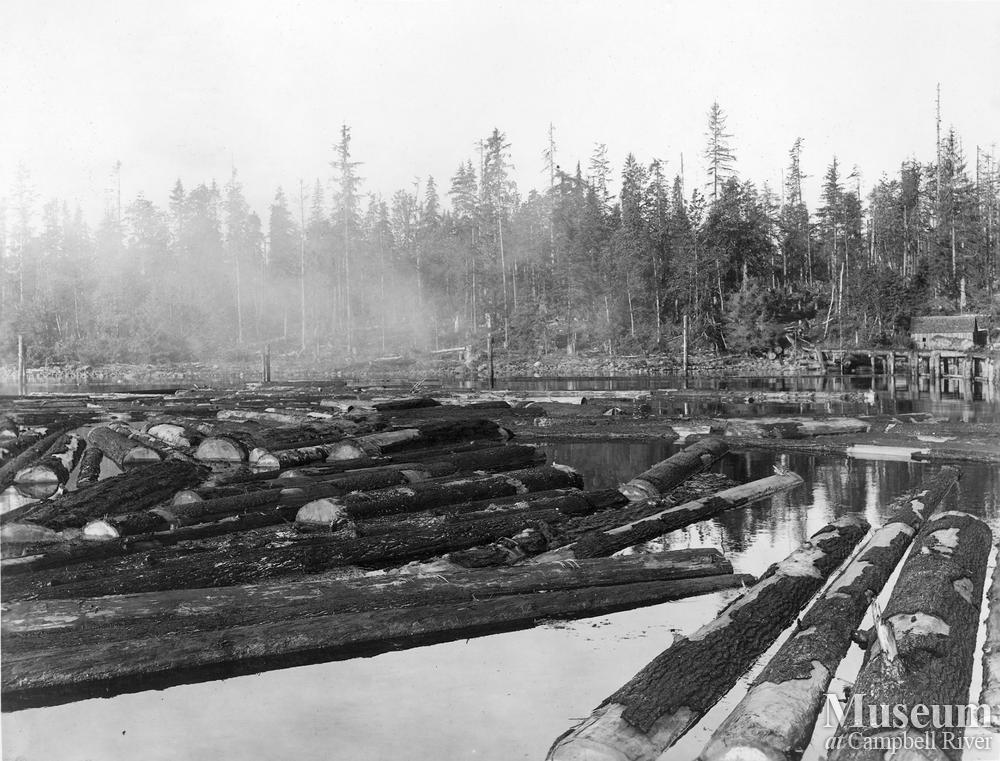 The log booms at the camp of Booth Logging Company (of Vancouver) at Menzies Bay, near the south entrance of Seymour Narrows.