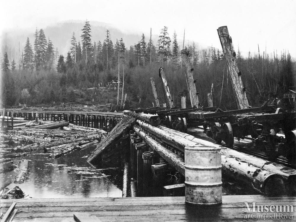 Log dump at P.B. Anderson's Camp at Knox Bay, Thurlow Island