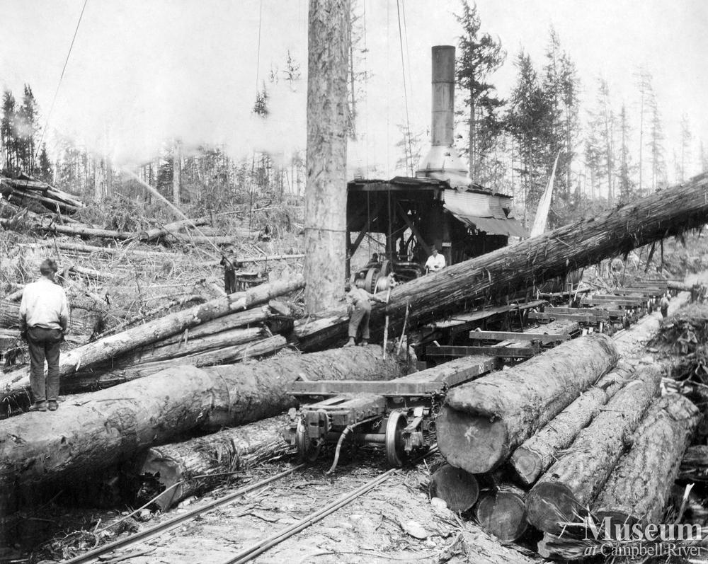 Steam donkey used for loading logs onto rail car near ERT Camp 7, Quinsam River.
