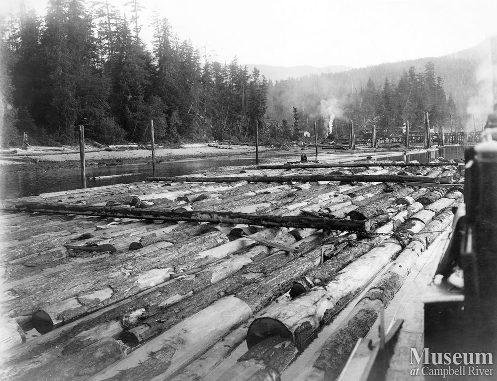 Fir log rafts of the Vancouver Lumber Company at Port Neville, B.C., viewed from the launch 'Kalmor II' and showing the locomotive at camp ready to start into the woods.