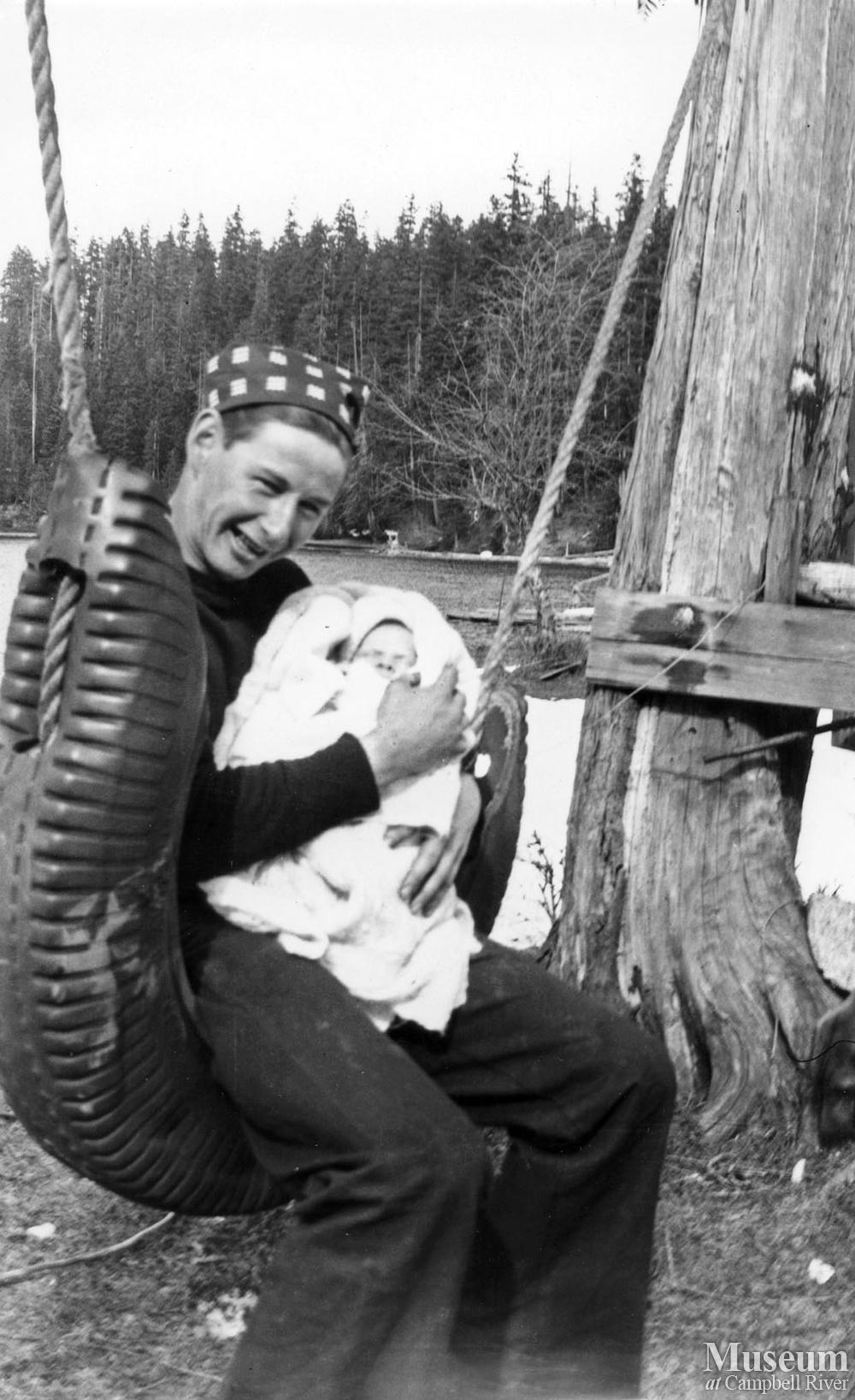Sparky Hughes holding a baby.