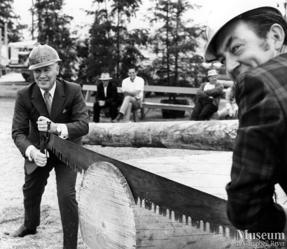 Elk River Timber Co.'s superintendent Danny McKenzie (left) competing in a crosscut saw bucking competition.