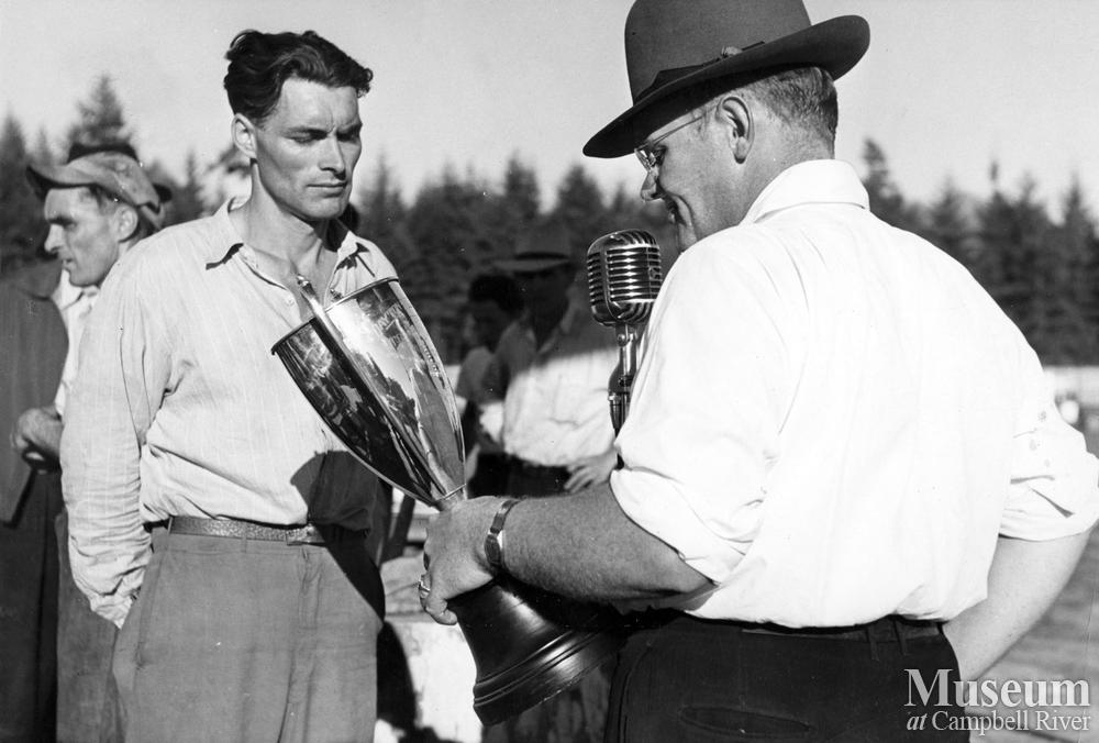 Vice President of I.W.A. Local 185 Walter Yates (right) presents Laurence McIvor (left) with the Dayton Shoe challenge trophy in Port Alberni.
