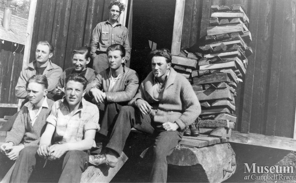 Sparky Hughes, Ray Manning, Tom Larnie, Willie Granlund, and three others on steps of bunkhouse at ERT camp, possibly at Camp 8 at Echo Lake.