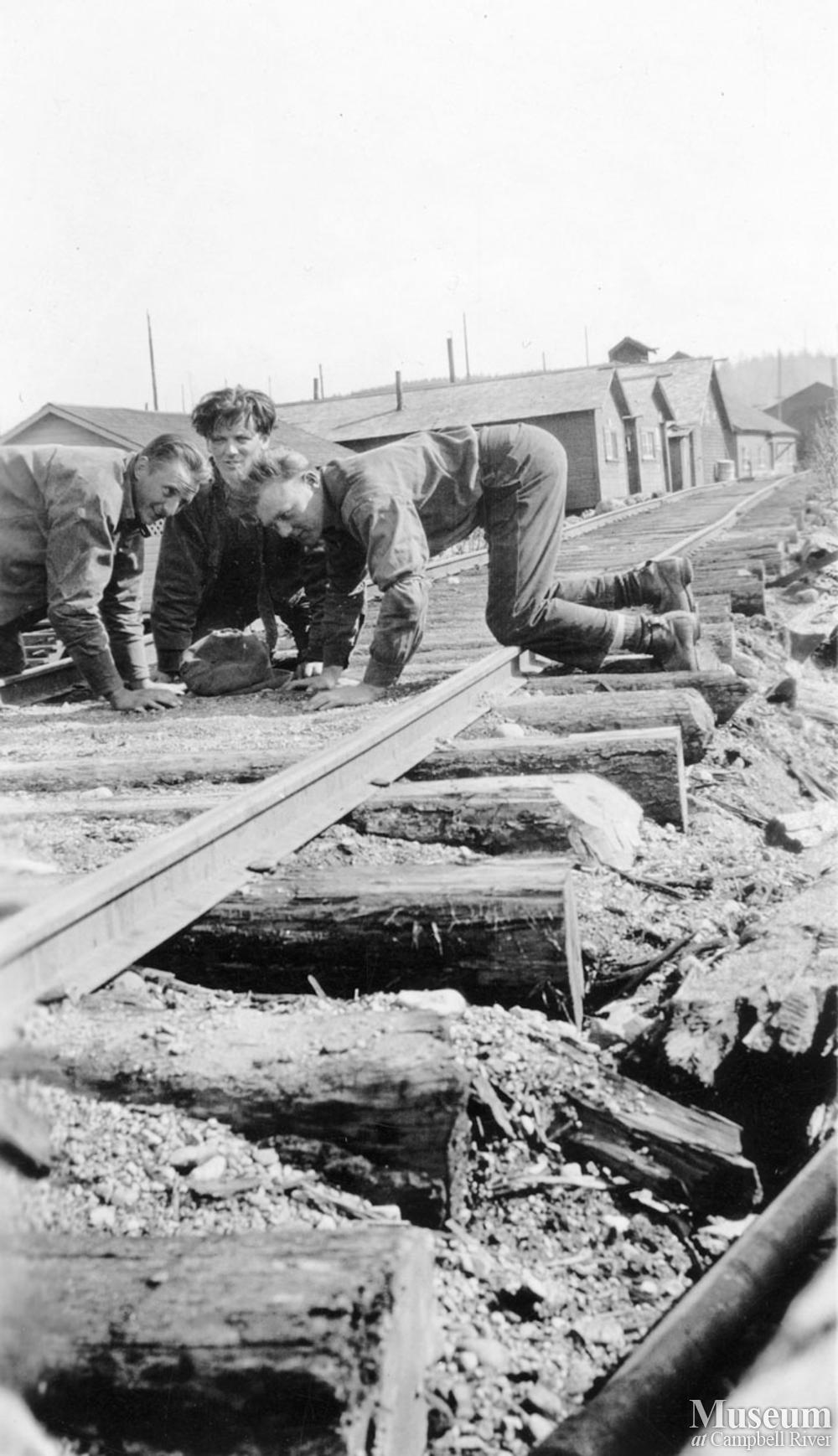 Loggers on railroad track at "Daddy Lamb's" Camp at Menzies Bay (Lamb Lumber Co.). Camp buildings in background.