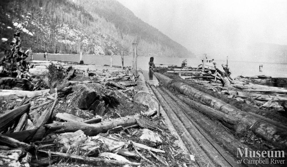 The boat on the right of the skid road was used to tow logs from various log dumps in the lake out to the road.