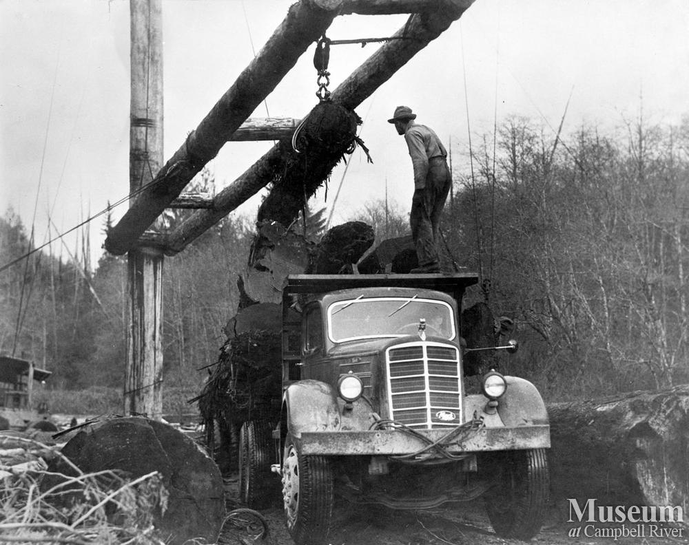 A hayrack boom loading a logging truck at a logging operation at Fulmore Lake, Port Neville.