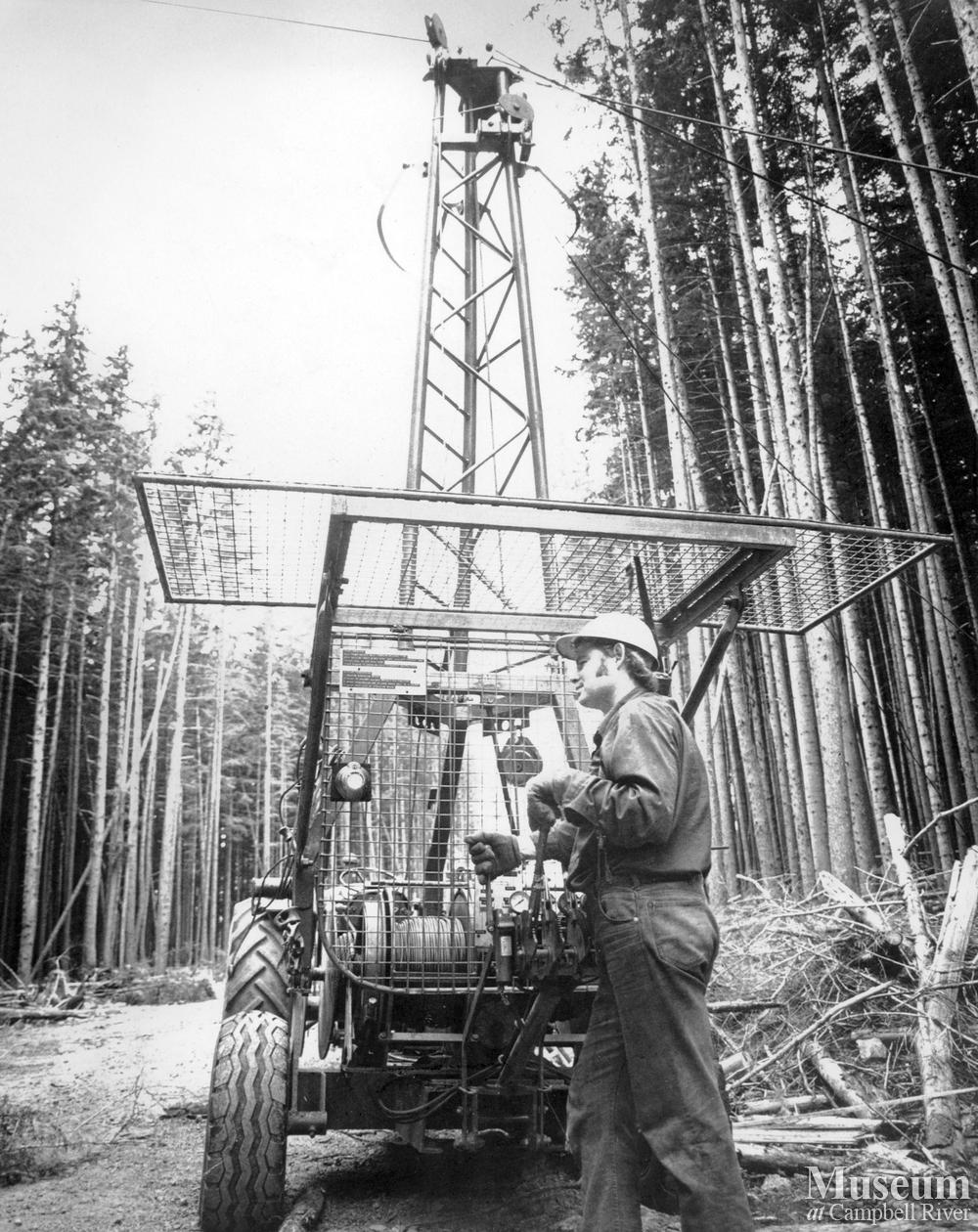 MacMillan Bloedel employee with an Alp yarder at Kelsey Bay.