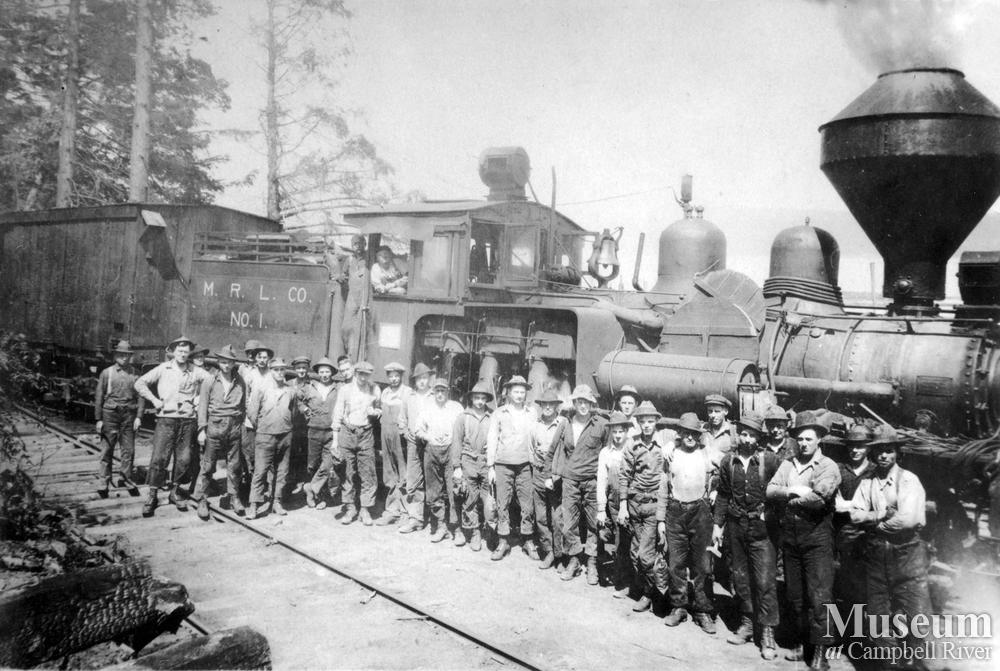 Merrill and Ring Logging Co. locomotives and crew at Duncan Bay. Locomotive at back is a Shay engine and in front is a locomotive used as a "crummy" for the woods crew. Crew indentification includes: Third on right, Bill ??, and fifth on right Gus Clements.