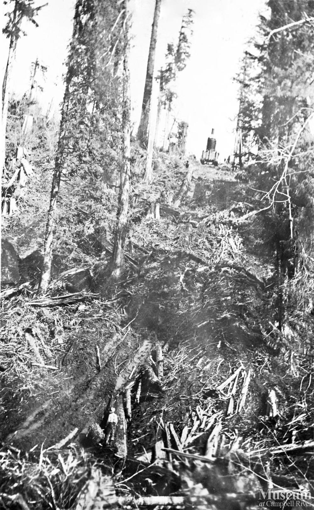 Steam donkey being moved up and hill, note the skid path it leaves behind. This photograph may have been taken at Elk River Timber co. operations near Campbell River.