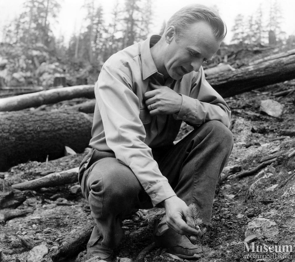 Dick Kosick, resident forester at Tahsis Co., Gold River division checks on a 2-year old Douglas Fir in an area replanted following slash burn, Tahsis Company's Gold River Logging division.