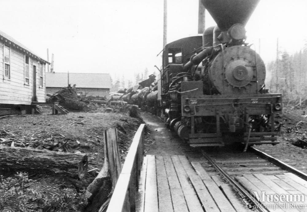 Nimpkish Timber Co., 5 spot locomotive on the tracks at camp 9, Nimpkish Lake area.