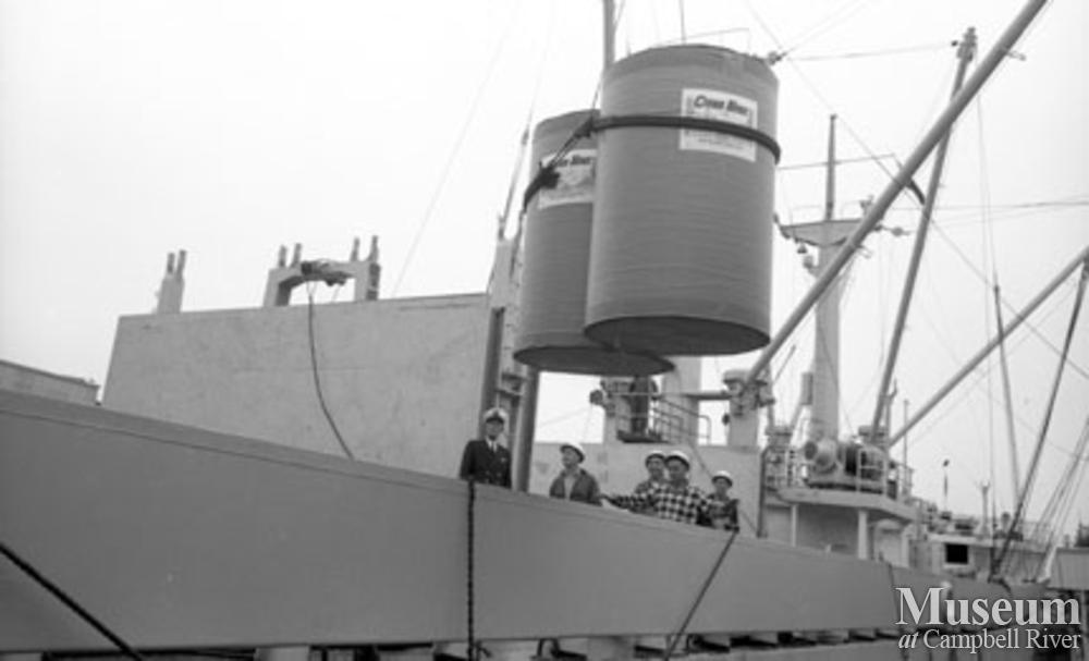 Paper rolls being loaded onto a ship for transport; the ship is the 'Trolleggen Oslo'.