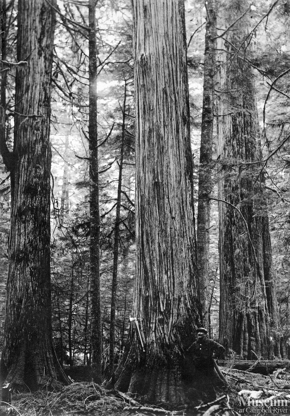 P.B. Anderson beside a stand of timber. P. B. Anderson operated early logging camps in the Knox Bay area.