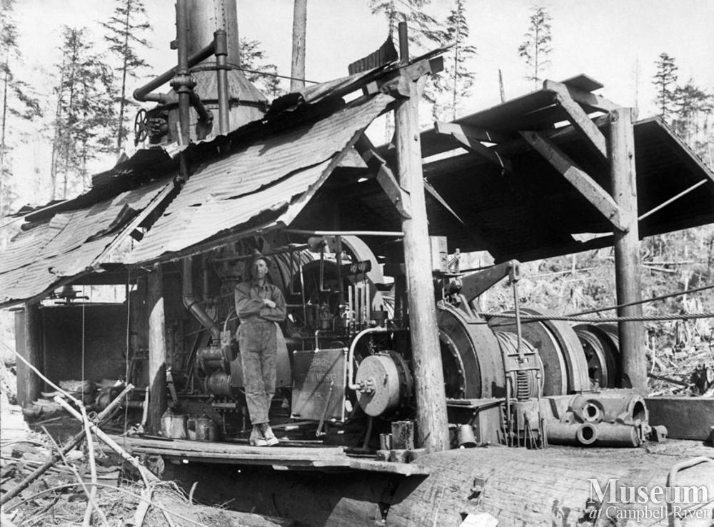Steam donkey and engineer at Knox Bay on Thurlow Island.