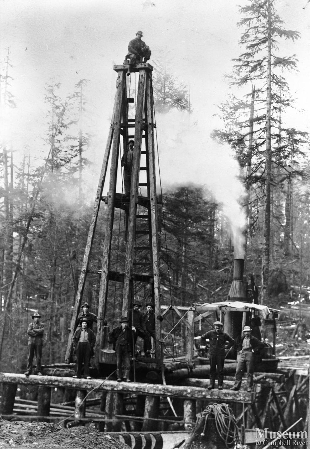 P. B. Anderson Logging Co.'s pile driving crew building a railway bridge at Knox Bay, Thurlow Island - P.B. Anderson is second from right.