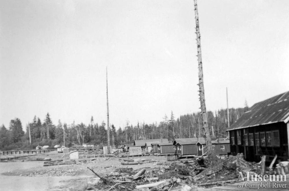 Beach front view of the logging camp buildings at Pioneer Timber Co. at their operations at Port McNeill.